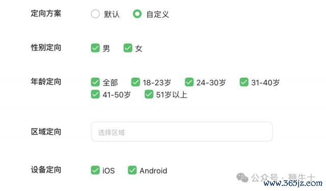 其中定向决策可遴荐默许或自界说,自界说方针用户可摆脱遴荐性别、年纪、区域、诞生。